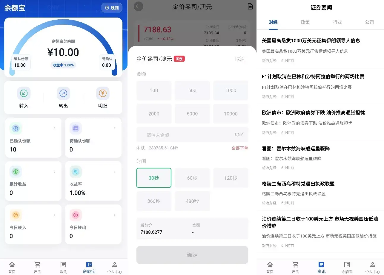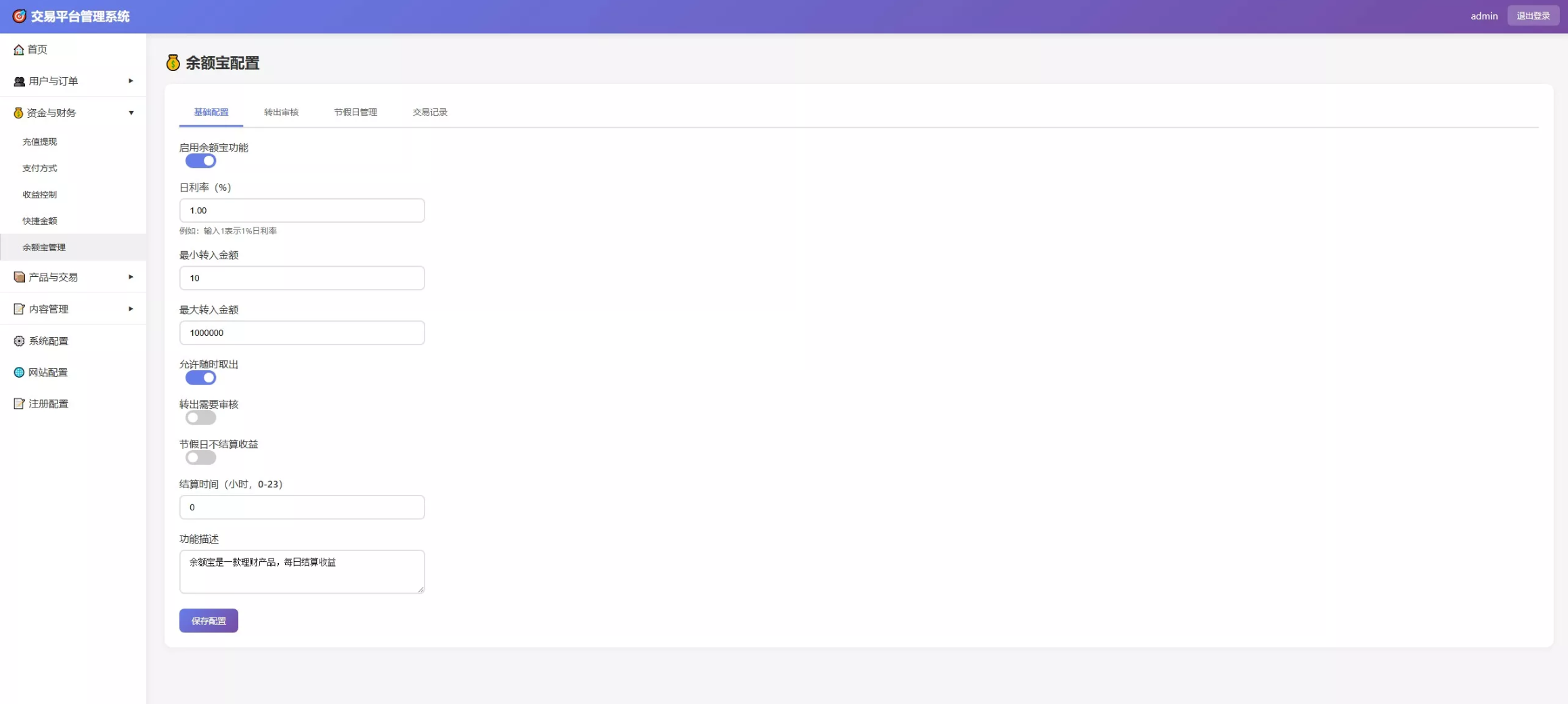 余利宝理财系统: 内置“余额宝”式理财模块,支持设置日利率(如 1%)、最小/最大转入金额,支持资金随时取出,极大提高用户入金意愿与留存率。