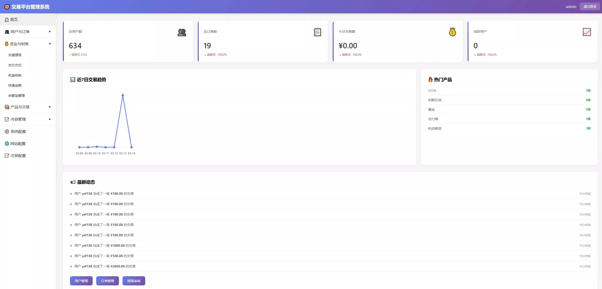 提供近 7 日交易趋势图表及热门产品排名,助力运营方精准决策。