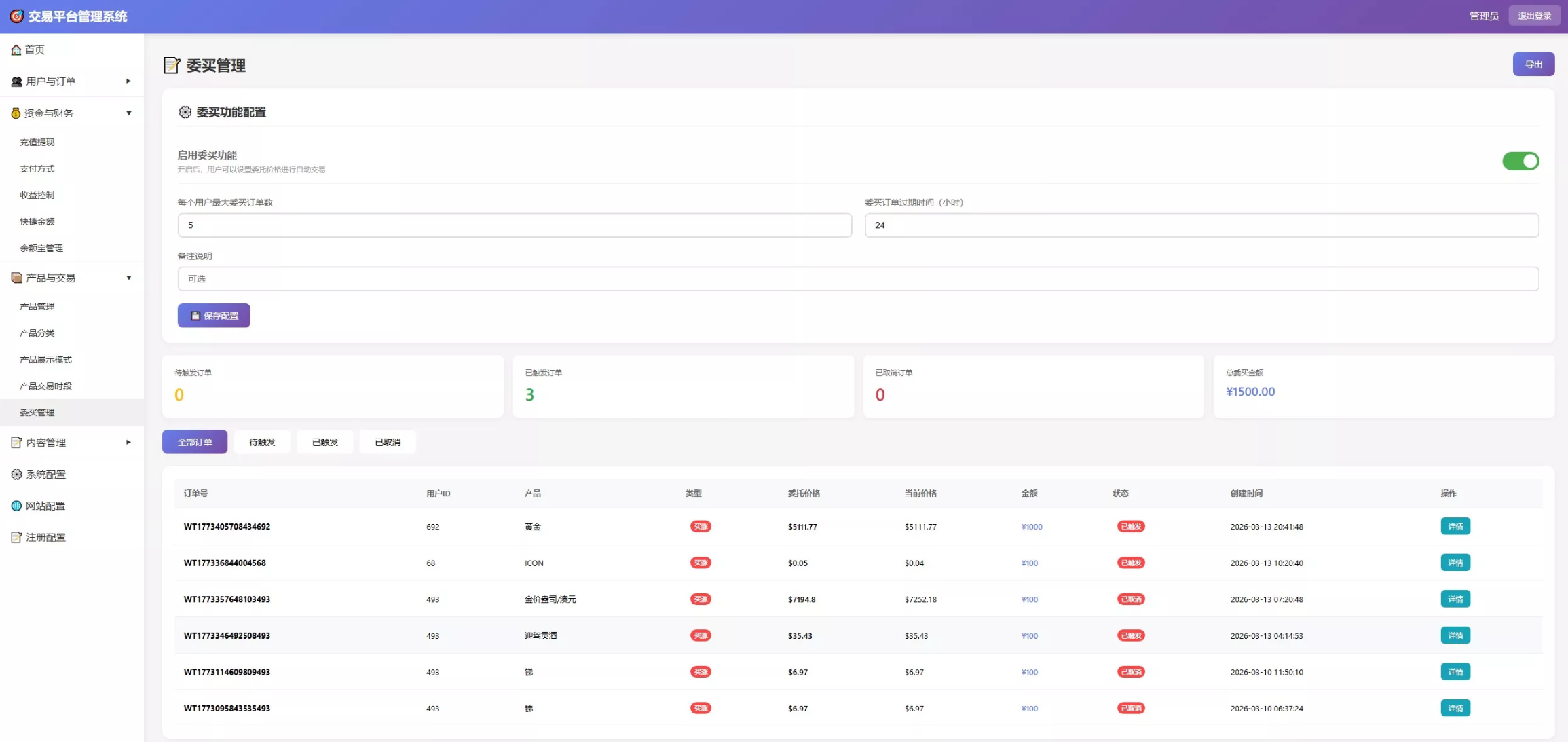 委买/委卖自动撮合: 具备完整的委买功能配置,支持设置每个用户最大委买订单数及过期时间,完美模拟真实交易所撮合环境。