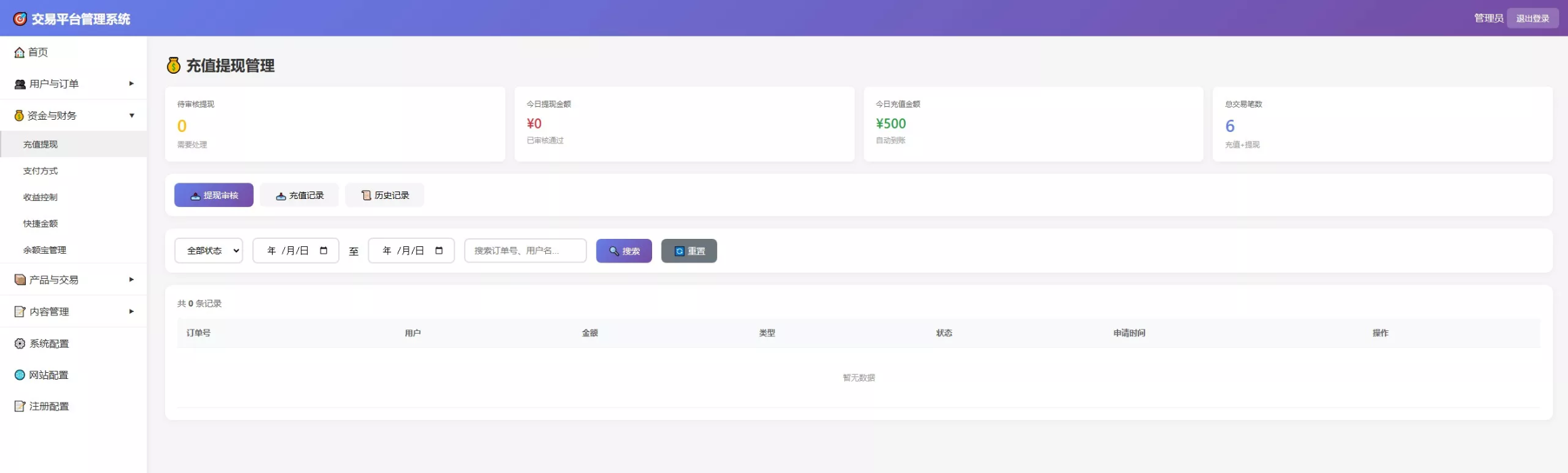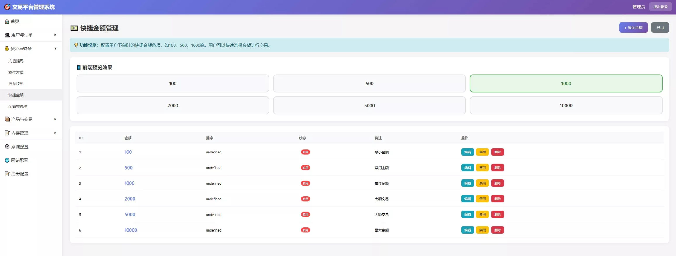 全方位财务管理: 灵活的支付方式配置(WeChat, USDT-TRC20, 银行卡),支持快捷下注金额(100-10000)自定义设置,充值提现流水后台秒级监控。