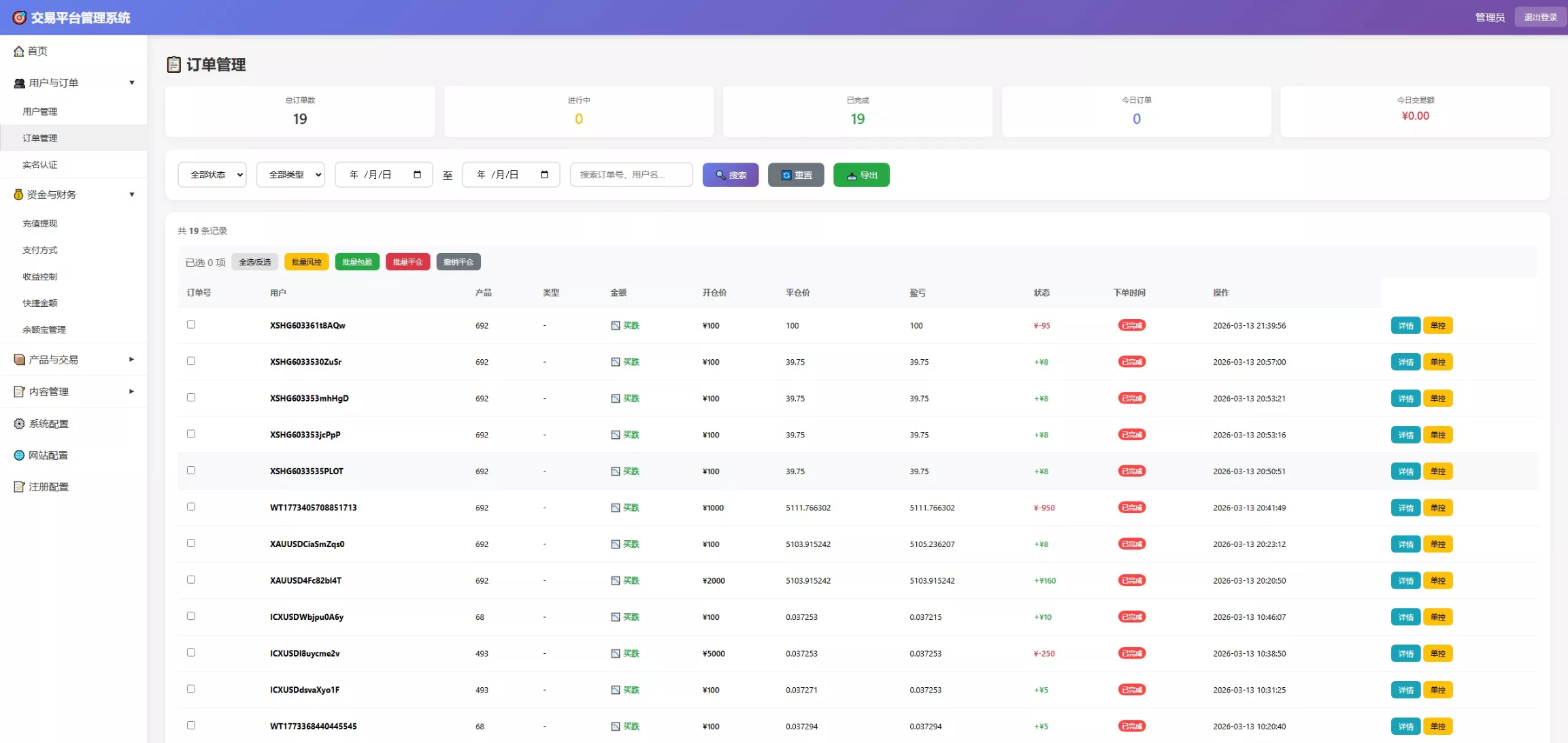 实时监控今日订单量、客户盈亏额、当日流水及手续费总额。